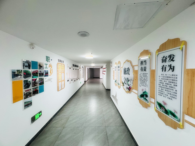 公司“文化墙”主要涵盖公司简介、历年发展历程、党建品牌、员工风采、“清廉国企”建设以及荣誉展示等宣传内容。文化墙不仅向外展示了公司蓬勃生机的企业形象和积极向上的精神风貌,也让一位员工清晰地认识到公司所秉持的价值观和发展观,时刻激励着全体员工铭记初心,不断进取,为公司的持续发展提供不竭的动力。